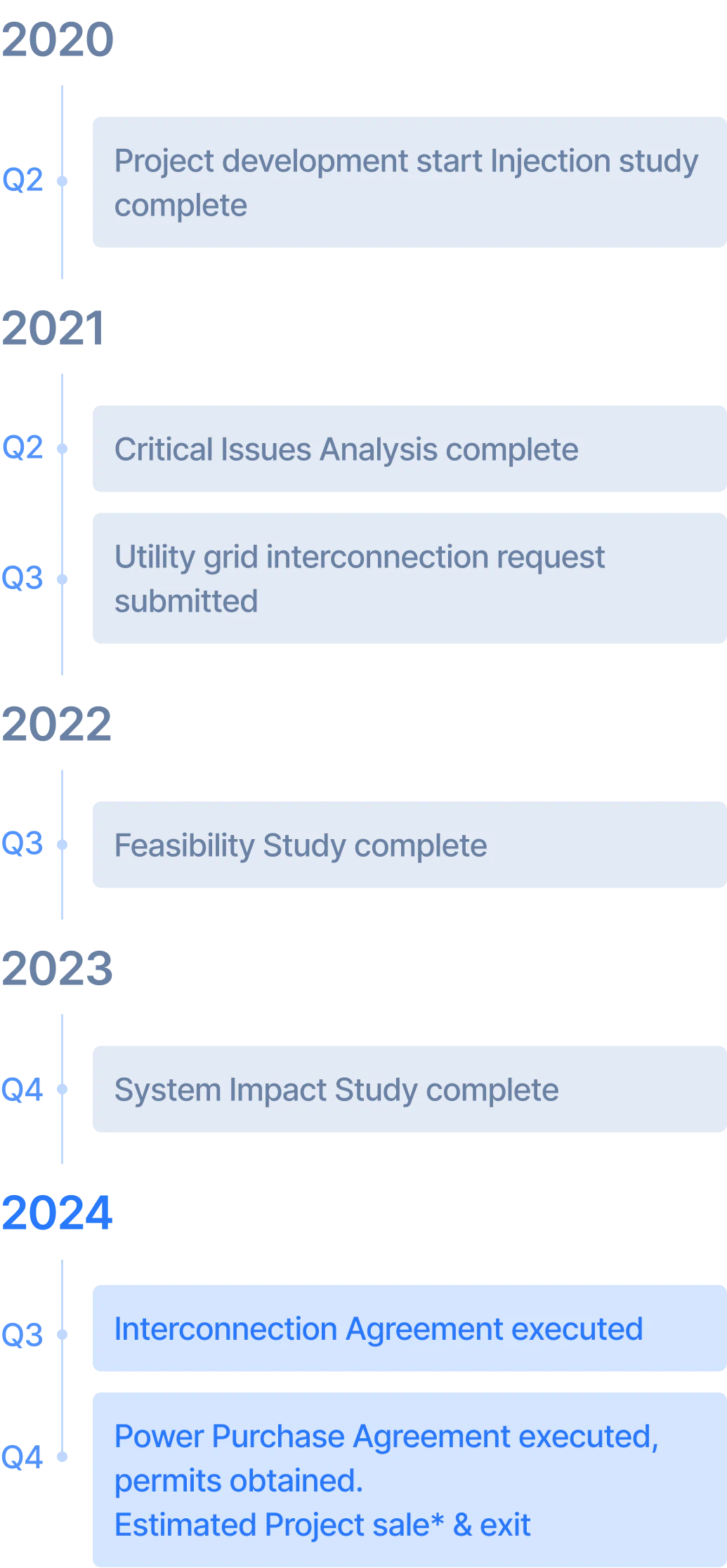 - Completed: site control and title search, feasibility studies, site design and preliminary engineering, utility grid interconnection application